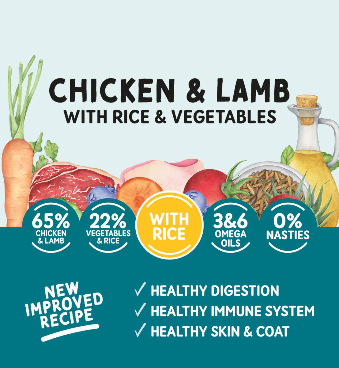 Our delicious Wet Dog Food contains 65% Chicken and Lamb, which are excellent sources of quality protein, B vitamins, iron, and zinc to support healthy muscles, energy delivery, skin and coat health, and oxygen delivery.