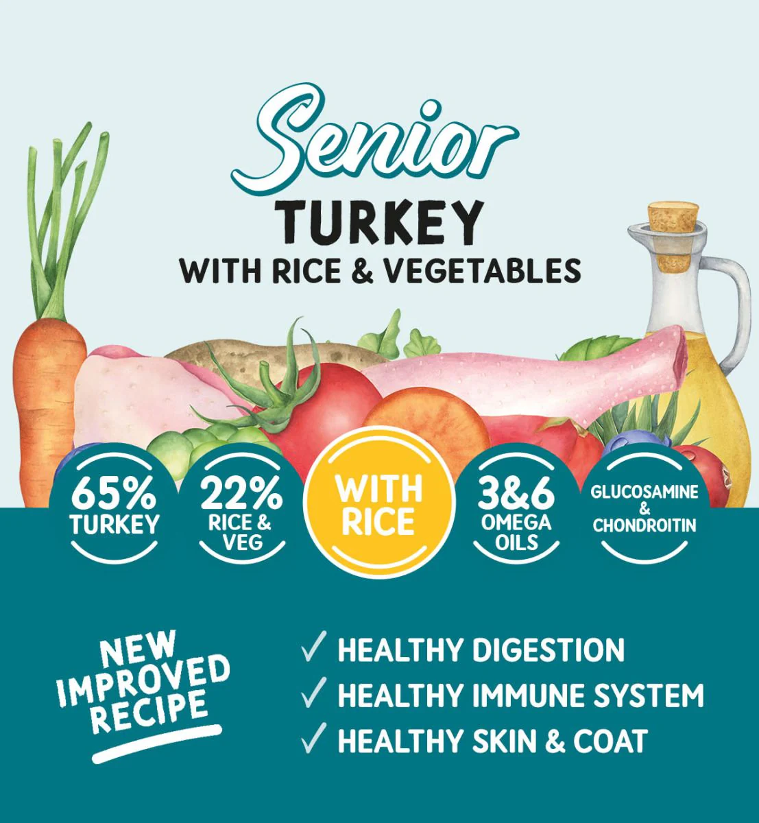 Our Senior Dog Food recipe is a complete pet food specifically made to be easily digested and delicate on Senior Dog stomachs. Glucosamine and Chondroitin are added into this wet dog food to help joint flexibility in our older four-legged friends so they can live their older years with reduced pain. We are confident your old companion will enjoy our delicious high meat content feast of 65% Turkey, an essential protein packed full of B vitamins, essential amino acids, and minerals, helping promote muscle growth and repair.